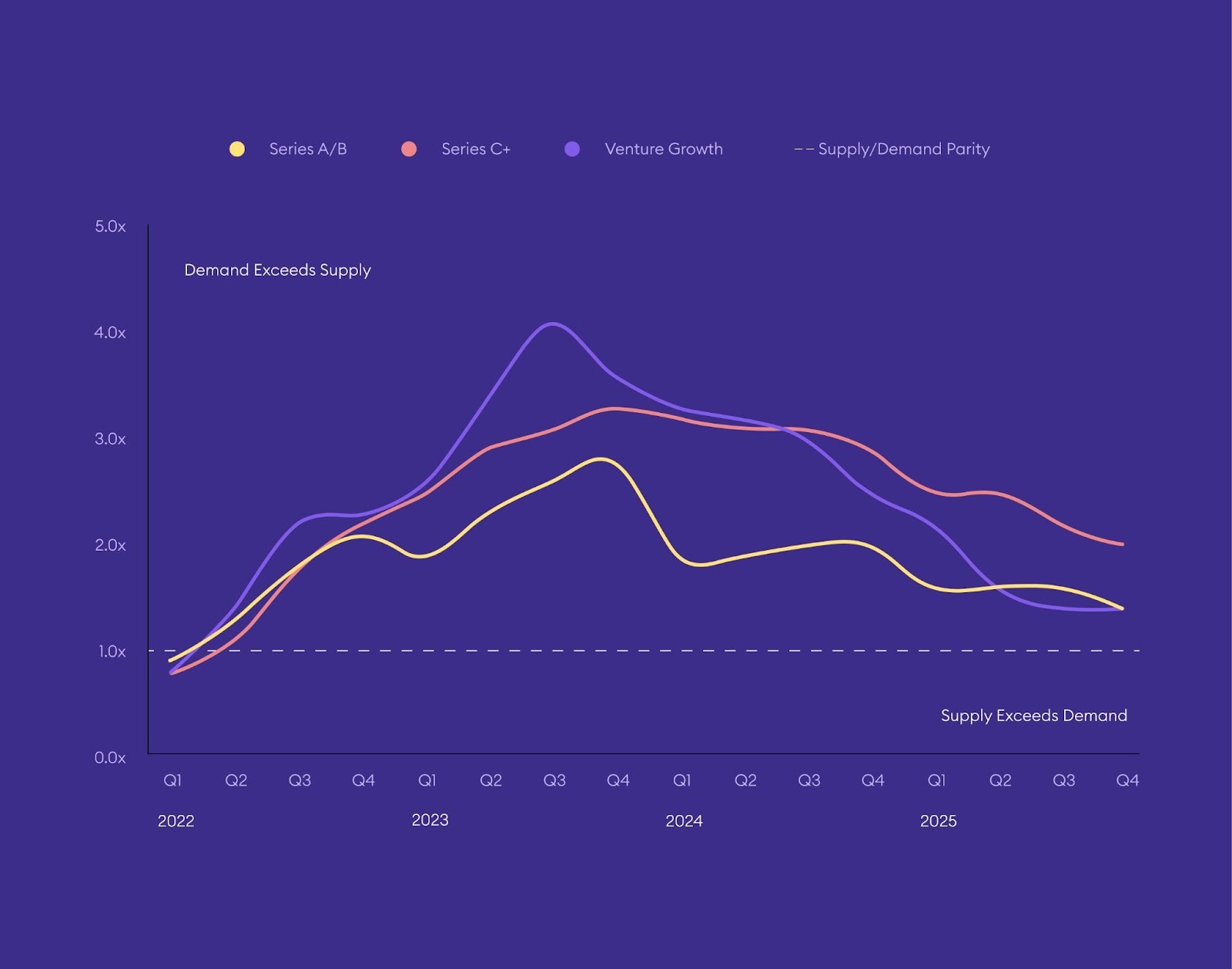 Later-stage companies (Series C+) are facing the sharpest effects of this imbalance. With investor capital concentrated in a narrow set of high-conviction themes, many scaled startups are extending runways, prioritizing profitability, and reassessing growth trajectories to avoid down-round financing in a constrained fundraising environment.