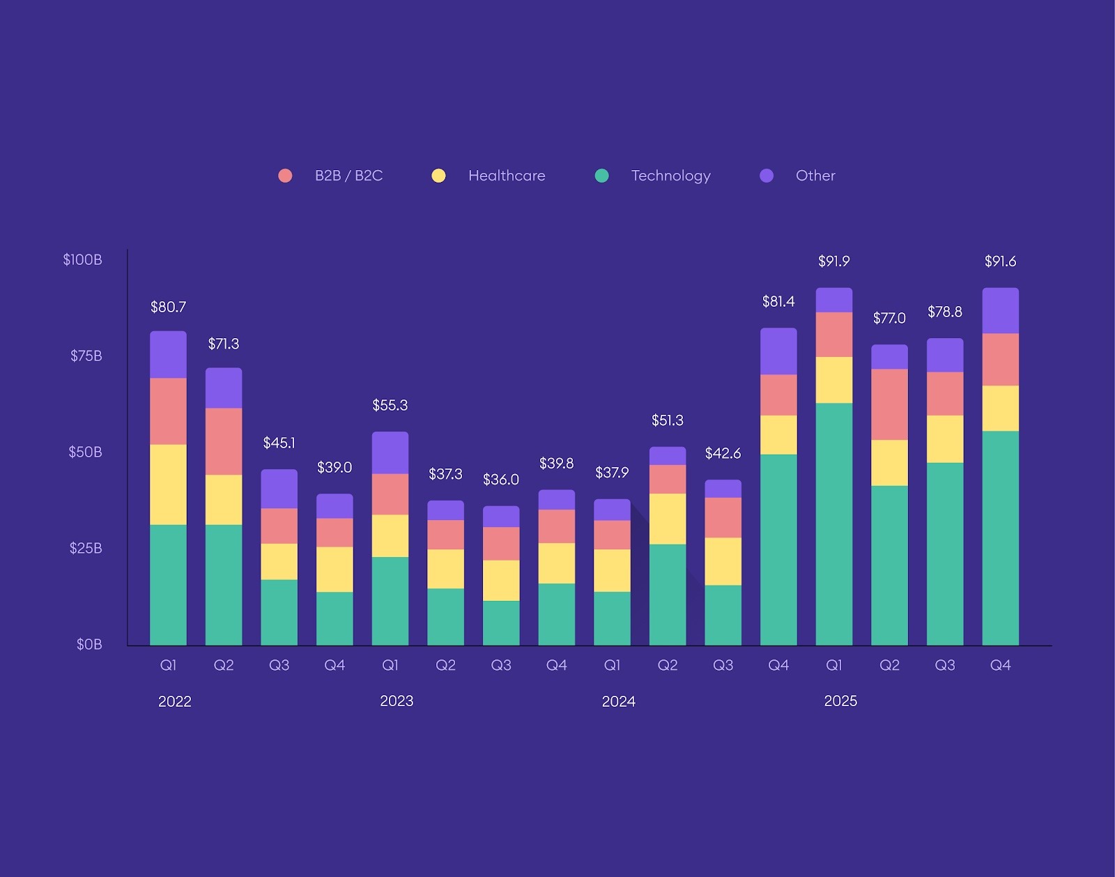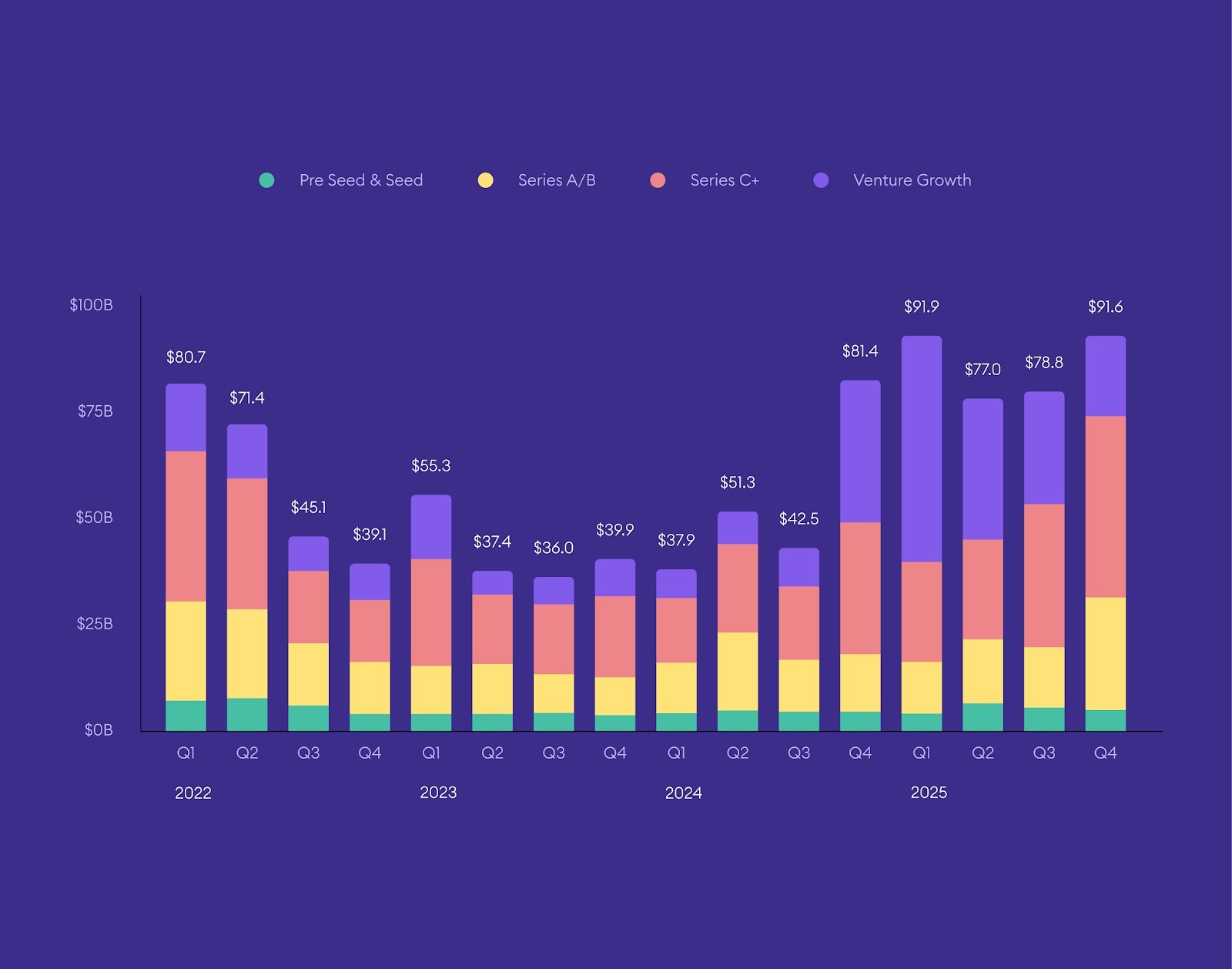 Q4 capped the year with $91.6Bn deployed across an estimated 4,482 deals. AI continued to anchor total dollars in Q4: 11 rounds reached or exceeded $1Bn, and the top 11 deals totaled $37.4Bn (41% of quarterly value).