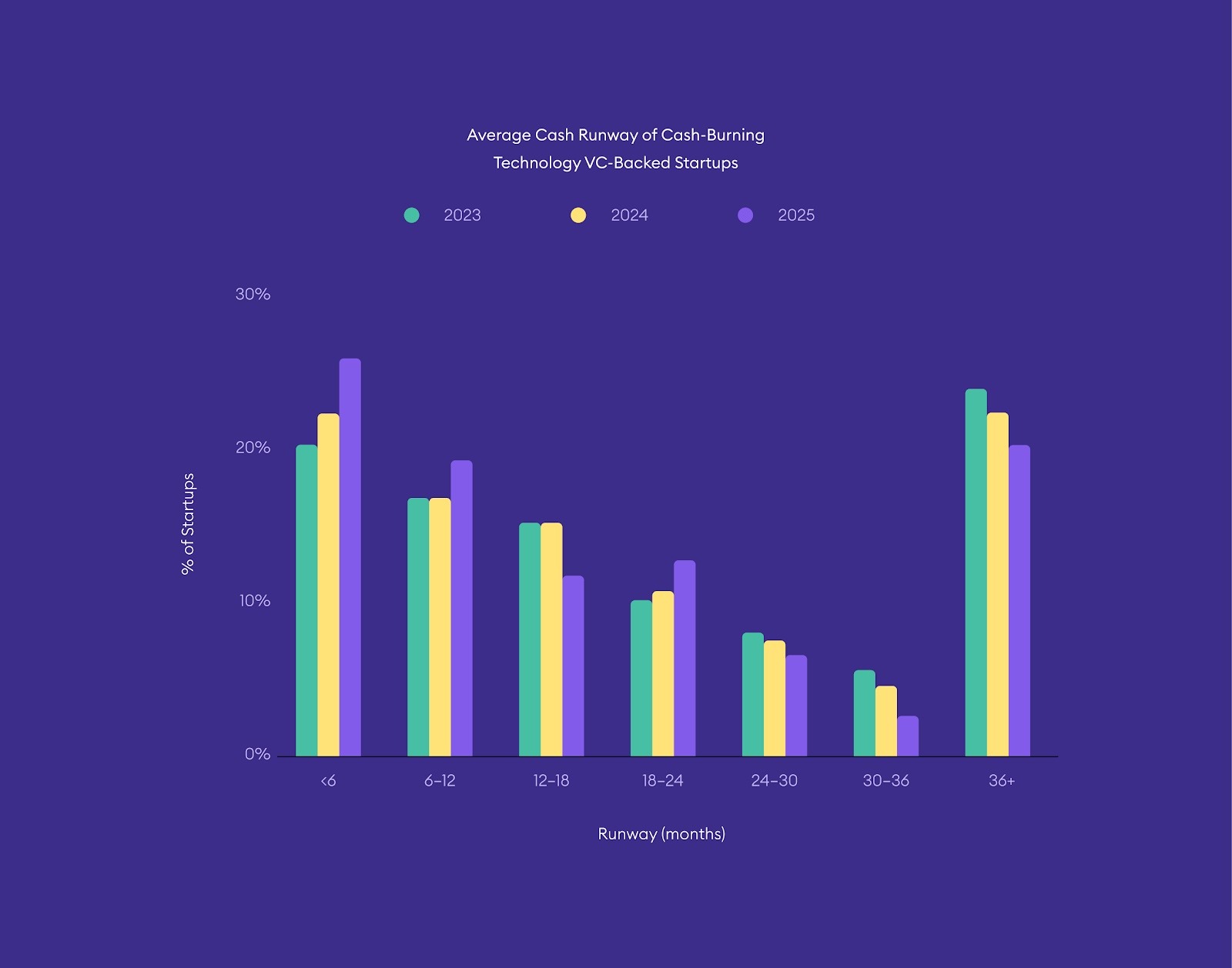 - Runway outcomes in 2025 were divergent across cash-burning tech companies. Pilot proprietary data showed a growing share of companies faced near-term liquidity pressure, with 26% holding less than six months of runway (up from 20% in 2023).