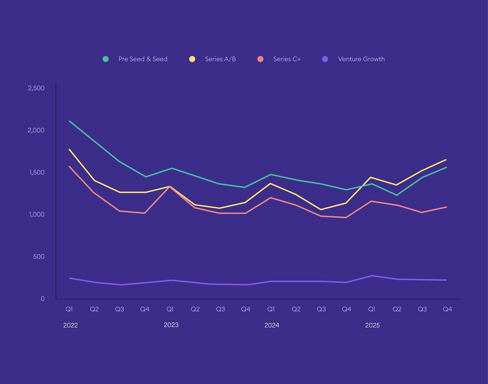 - Valuations stabilized in 2025, with median pre-money valuations rising across stages, driven by the return of higher valuation multiples and a more favorable macro backdrop. Yet, pricing power remained concentrated among top-tier companies.