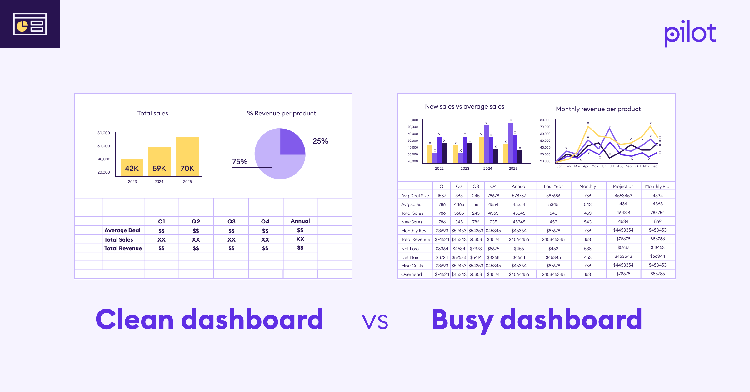 Of these two dashboards pictured, which is easier to follow? Sometimes, less is more, and having too many metrics can mean you make no decision at all. Try to limit yourself to 3-4
